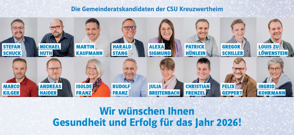 Stefan Schuck, Gemeinderat (Kreuzwertheim) wird die Liste der CSU Kandidaten anführen. Weitere Bewerber sind Michael Huth, Gemeinderat (Röttbach), Martin Kaufmann, Gemeinderat (Röttbach), Harald Stang, Ortssprecher (Unterwittbach), Alexa Sigmund (Kreuzwertheim), Patrick Hünlein (Kreuzwertheim), Gregor Schiller (Kreuzwertheim), Erbprinz Louis zu Löwenstein-Wertheim-Freudenberg (Kreuzwertheim), Marco Kilger (Kreuzwertheim), Andreas Haider (Röttbach), Isolde Franz (Röttbach), Rudolf Franz (Röttbach), Julia Breitenbach (Wiebelbach), Christian Frenzel (Röttbach), Felix Geppert (Röttbach), Ingrid Kohrmann (Unterwittbach).
